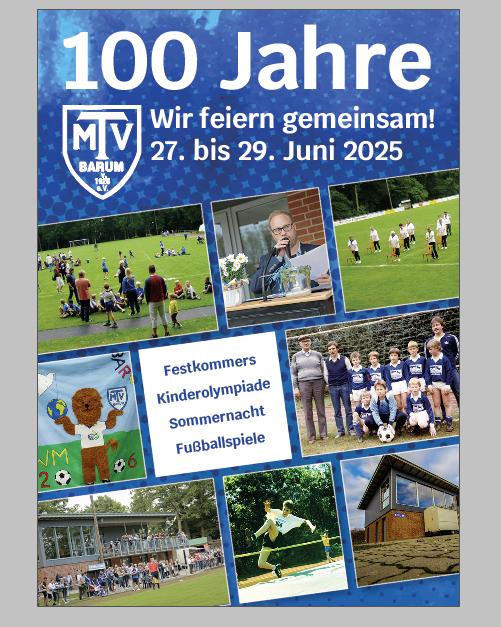 Der Sportverein MTV Barum v. 1925 e.V. feiert ein ganzes Wochenende sein Bestehen im Gemeindegebiet Barum. Wir gratulieren zum 100-jährigen Jubiläums und weisen hiermit auf das Festwochenende vom 27. bis zum 29. Juni 2025 auf dem Barumer Sportplatz hin. Weitere Informationen gibt es auf der Webseite des MTV Barum.